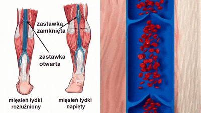 To skurczenie otwiera zastawki żylne i wypycha starą, zalegającą krew we właściwym kierunku, przeciwdziałając sile grawitacji.